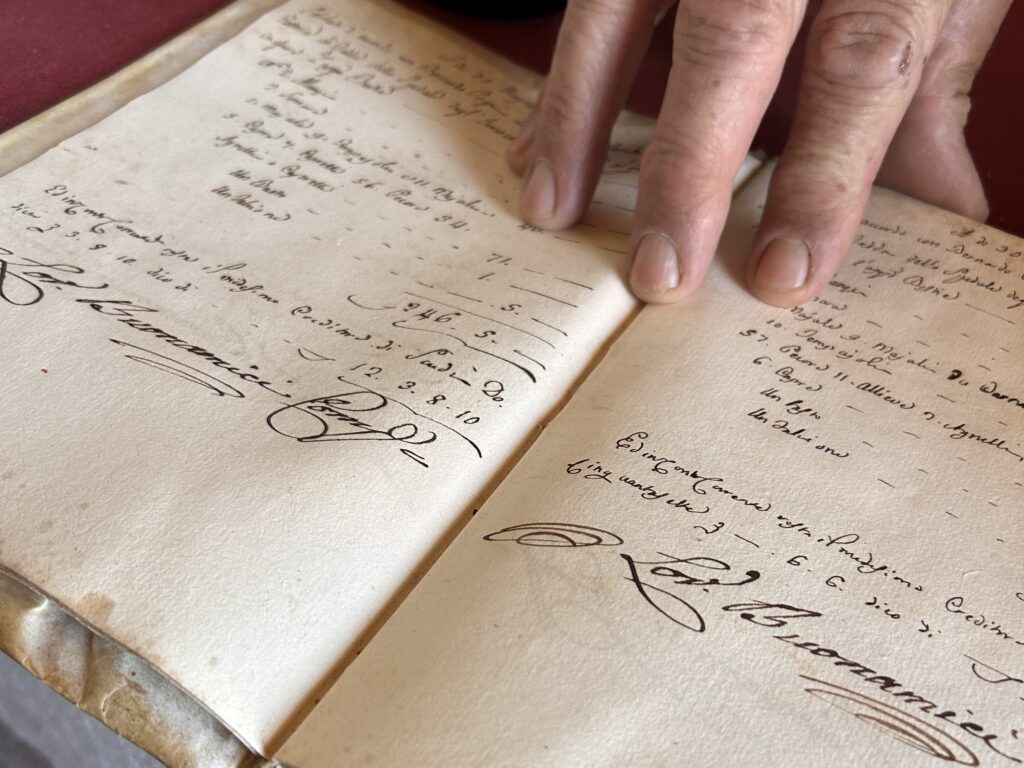 He brought out an old accounting notebook from the time of mezzadria, the sharecropping system that defined rural Tuscany for generations.